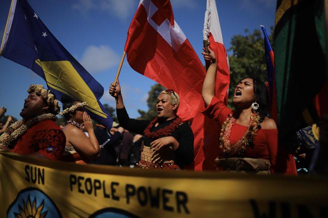 Mientras los escolares de Kiribati coreaban, con el puño en alto, “no nos estamos ahogando, estamos luchando”, de acuerdo a las imágenes divulgadas en Twitter por la ong ecologista 350.