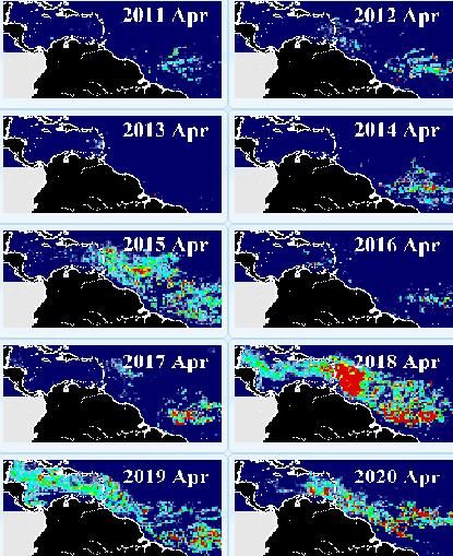 En los gráficos siguientes de SFU, se compara la cantidad de sargazo los meses de abril de 2011 a 2020.