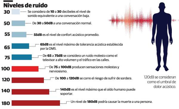 La contaminación sónica es la responsable de grandes enfermedades como la sordera, tinnitus o silbido en el oído, nerviosismo, insomnio, estrés, agresividad, mareos, falta de concentración, afecta el metabolismo del cuerpo, y a los niños les produce problemas intestinales y respiratorios según estudios.
