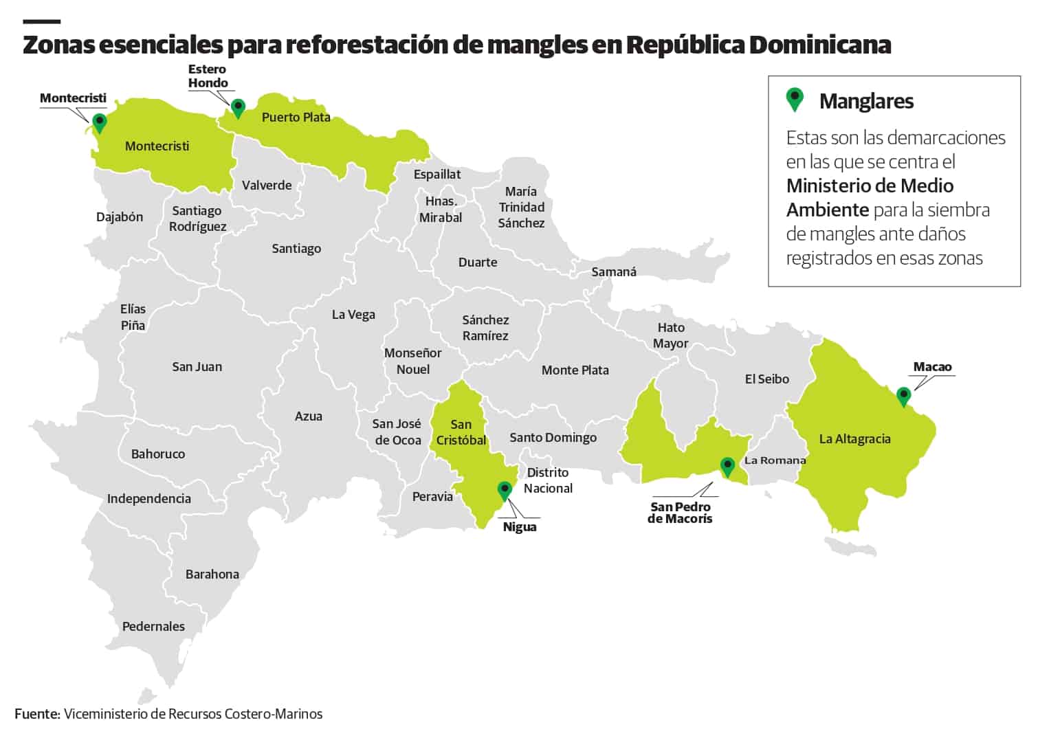 El titular del Viceministerio de Recursos Costeros-Marinos sostuvo que para este año se han propuesto sembrar 100,000 mangles en territorio nacional, sobre todo en zonas como Nigua, Montecristi y Macao (La Altagracia), siendo este último el espacio en donde se sembrarán alrededor de 10,000 mangles, puesto que en 2018 “fue arrasada”.