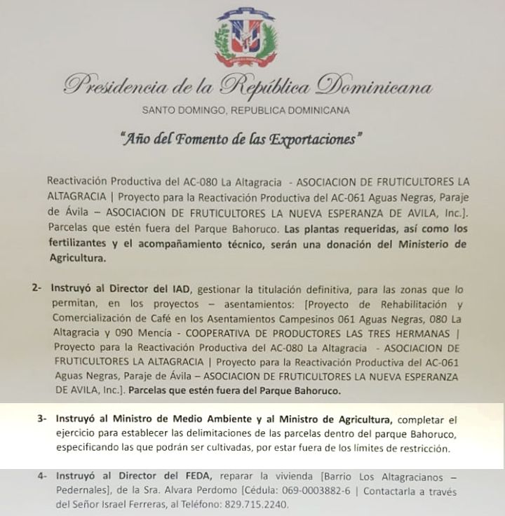 No, no es nuevo, de hecho hace varios años que se viene denunciando esta situación. Incluso el proceso ha llegado a una demanda internacional encaminada por SOSAmbiente ante el DRCafta, por el cultivo ilegal de aguacates en la zona. Luego de insistentes esfuerzos de los ambientalistas, el entonces Ministro de Medio Ambiente, Francisco Domínguez Brito, emitió en abril pasado la resolución No. 0022/2018 que, entre otras cosas, manda al «cese de todas las actividades agrícolas y ganaderas que se desarrollan en los límites del Parque Nacional Sierra de Bahoruco» y daba un plazo de 60 días para retirar los cultivos.