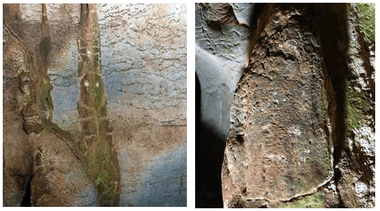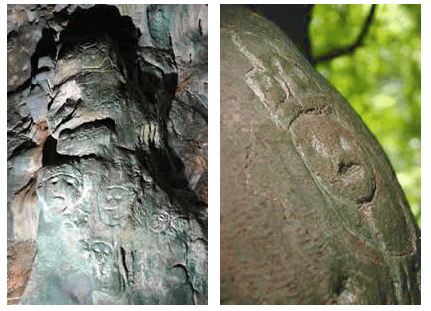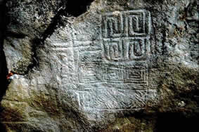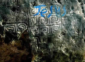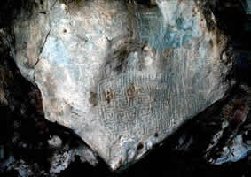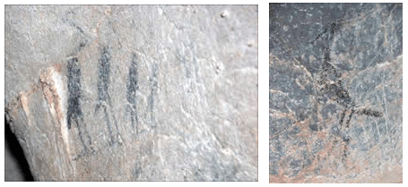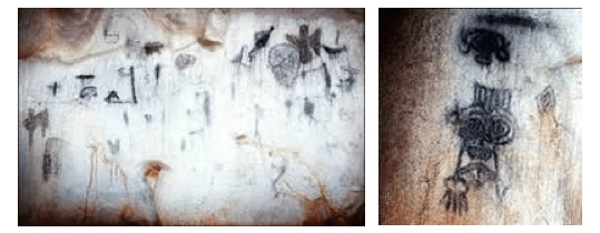 La boca de la cueva se abría a mitad de la empinada ladera y de inmediato aparecieron una serie de petroglifos en la misma entrada. Los petroglifos se hallaban dispersos en paneles en varias