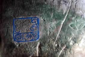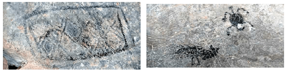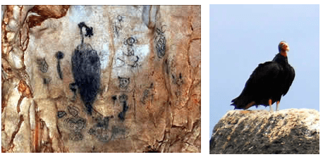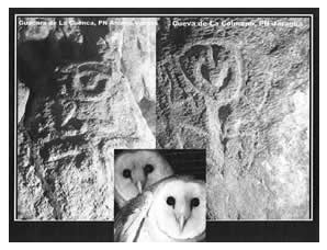naturalismo y de medidas impresionantes, pues la mayor mide más de un metro de altura. Grandes máscaras rituales y multitud de aves se suceden pintadas en los paneles de la caverna. Los petroglifos son de gran calidad y uno de ellos, el mejor terminado sugiere una relación con la pintura del gran ibis. Este ibis ocupa todo un panel preferencial que lo enmarca en su totalidad, dando la sensación de hallarnos ante un cuadro enmarcado por la roca.