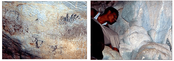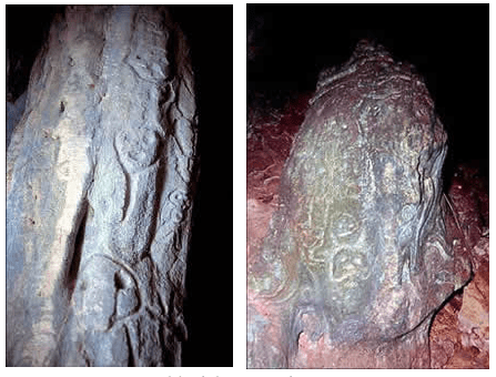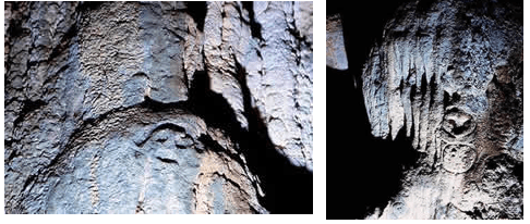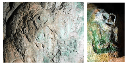 zonas de la cavidad. Tras la primera gran sala, de unos 30 metros de anchura por 20 de profundidad, encontramos otra pequeña sala, ya en semi oscuridad, donde encontramos más petroglifos y algunas pinturas.