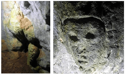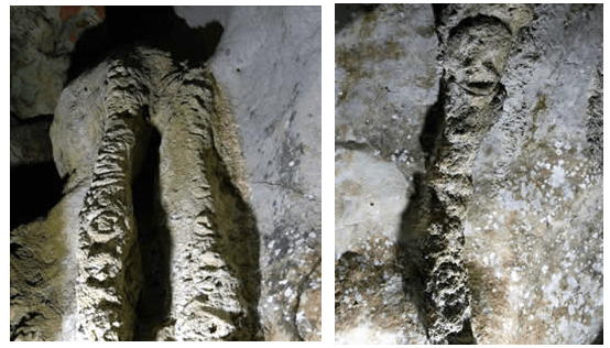 A la derecha de la figura encontramos otro bajorrelieve perfectamente delineado y profundamente grabado en una estalagmita de pequeño tamaño. La figura, dotada de cara y torso, con los brazos recogidos sobre el pecho, observa a la mujer embarazada que yace tendida frente a él.