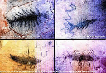 Un interesante pez se localiza en la cueva. Esta pintura se repite casi idéntica en otras cavernas de la isla, lo que nos demuestra que se trata de algún tipo de representación mitológica de gran importancia.