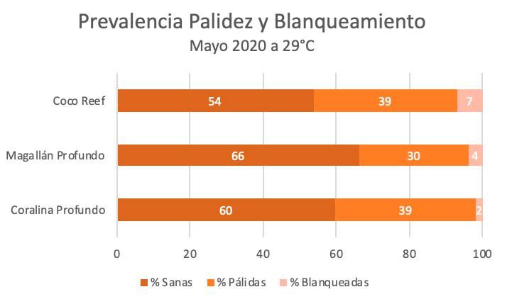 Lamentablemente, durante un monitoreo de rutina entre el 5 y 8 de mayo de este año, en los viveros de coral que maneja la fundación, encontraron temperatura alta del agua de mar para este mes de aproximadamente 29°C. Al hacer una evaluación de blanqueamiento, esta arrojó datos altos de palidez de corales de un 50%.