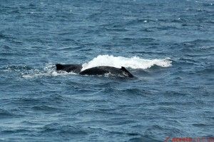 Pero la ballena que aparece roba la atención de su público. Escoltada por un ballenato, la enormeballena se desplaza con soltura por las aguas turbulentas de la Bahía de Samaná. En medio de la tarde nublada por la lluvia de febrero se muestran como un canto a la vida y a la inmensidad del planeta que las acoge. Los flashes recogen sus momentos en la superficie.