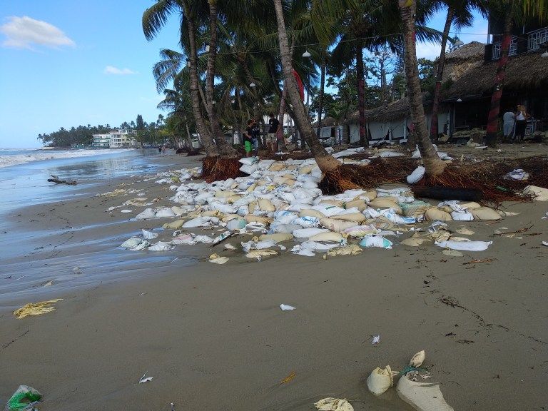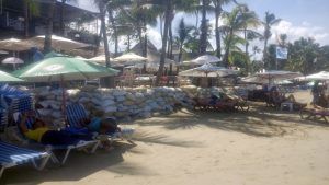 Durante las tormentas Maria y Irma, los bares y restaurantes pusieron muchos sacos de arena en la playa para salvar su espacio. Ellos actuaron como si la playa es de ellos con instalaciones fijas en la playa misma. Después de las tormentas, dejaron los sacos.