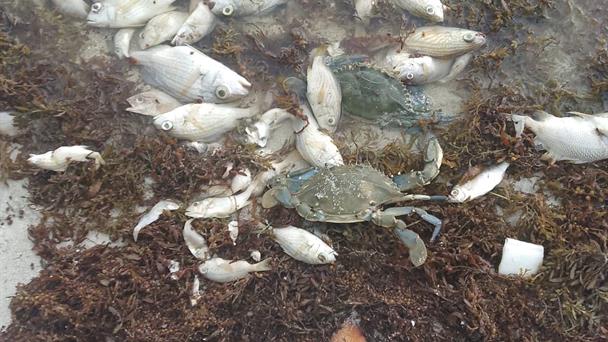 «La playa está llena de peces muertos de todos los tamaños, no son solo los que están en la orilla, hemos caminado hacia adentro y todo eso blanco que se ve son peces», relató Manuel Castro, prestador de servicios acuáticos en la zona.