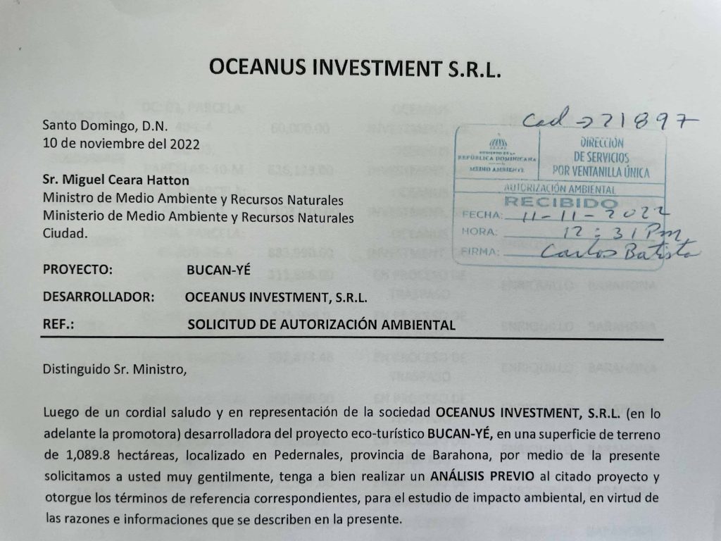 Sin embargo, Diario Libre obtuvo una copia de la solicitud de autorización ambiental del proyecto, del 10 de noviembre del 2022, para iniciar el proceso de evaluación ambiental, bajo el código 21897 BUCANYE. Una fuente dentro del Ministerio confirmó a DL el depósito, pero la solicitud no presenta actividad desde el 20 de noviembre, no se ordenó la debida inspección del proyecto.