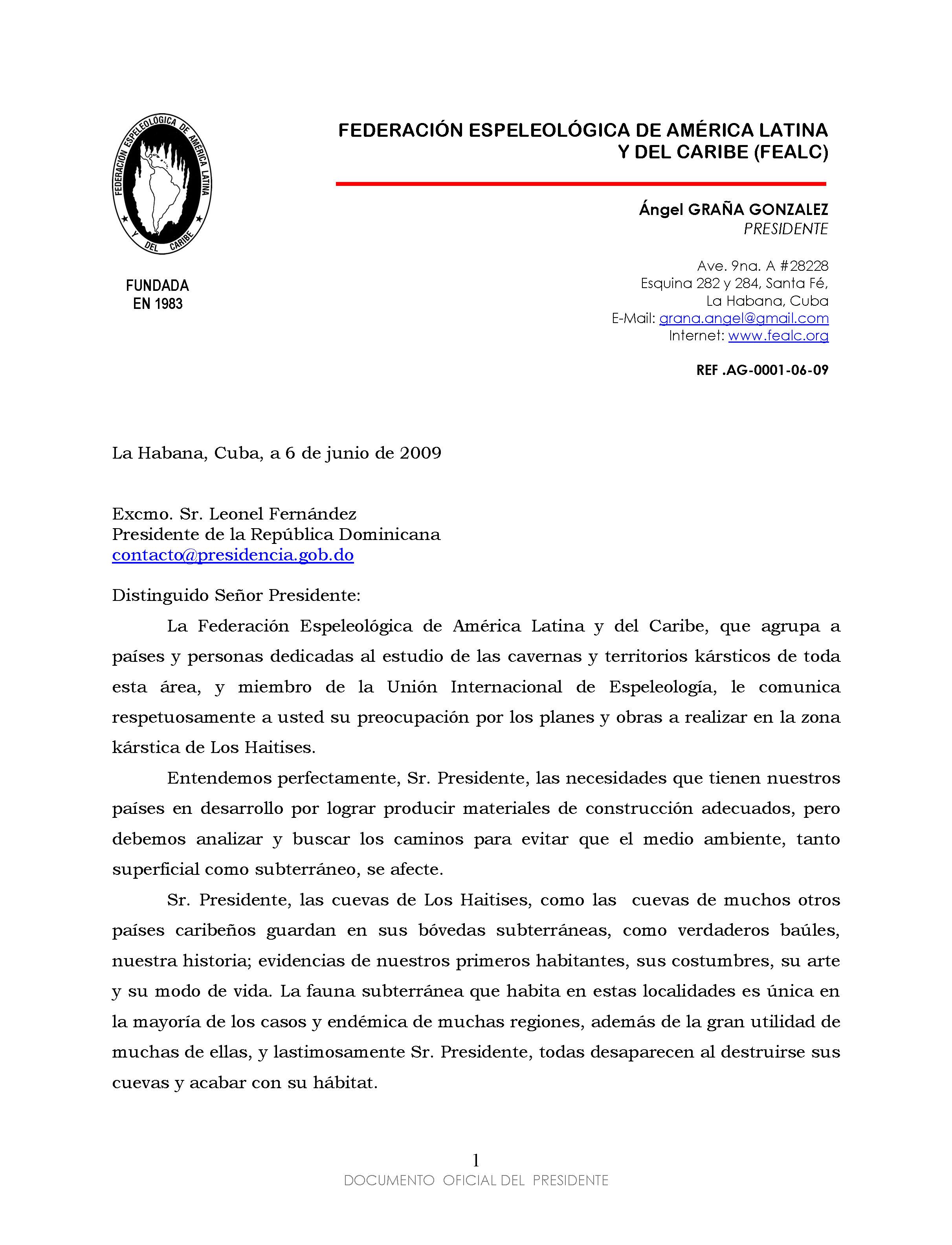 La Federación Espeleológica de América Latina y del Caribe, que agrupa a países y personas dedicadas al estudio de las cavernas y territorios kársticos de toda esta área, y miembro de la Unión Internacional de Espeleología, le comunica respetuosamente a usted su preocupación por los planes y obras a realizar en la zona kárstica de Los Haitises
