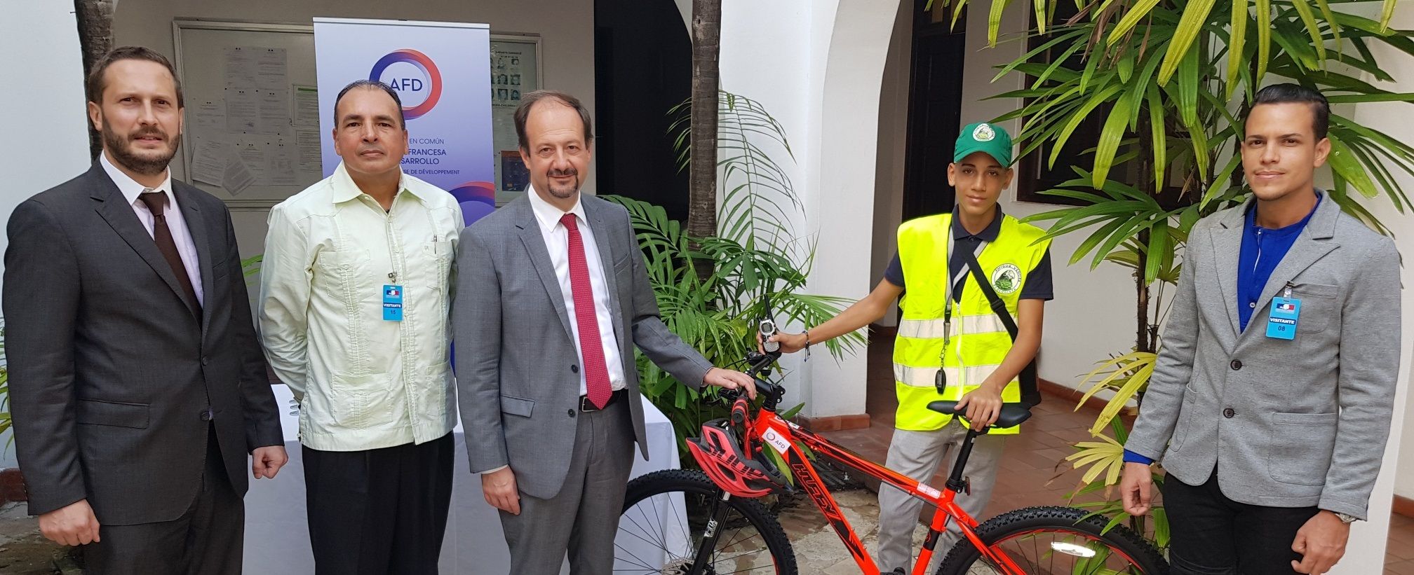 SANTO DOMINGO, República Dominicana.- El pasado 12 de diciembre de 2017, la Agencia Francesa de Desarrollo (AFD) hizo entrega de una donación de ocho bicicletas todo terreno que servirán para apoyar la ejecución del proyecto “Veragua”, iniciativa de la fundación Amigos Verdes, cuyo principal objetivo es descontaminar y reforestar los ríos de país, entre ellos el río Jimenoa en Constanza, afluente del río Yaque del Norte, el cual brinda acceso al agua a quince comunidades y produce energía a una hidroeléctrica en la provincia de La Vega.