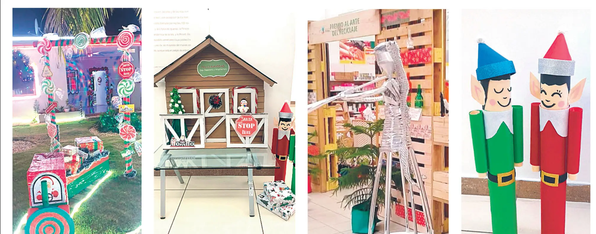 “Nos dedicamos desde finales de octubre a recolectar materiales como cajas de cartón de distintos tamaños, cuadros de foam en los que se empacan electrodomésticos, piñas de pino naturales, platos desechables, rollos de papel, y también rebuscamos adornos navideños de años anteriores que teníamos en casa para confeccionar nuevas obras de arte para alegrar cada rincón de las casas las oficinas”, detalló Laura Oviedo.