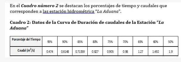 Los valores medios de caudales no son siempre el mejor indicador de la viabilidad hidrológica de la sostenibilidad hídrica-operativa de un sistema de riego. En la Figura números 1 y 2 se muestra la curva de duración de caudales para la estación “Don Miguel” y la estación “La Aduana” respectivamente. La curva de duración de caudales que es una representación de la frecuencia del tiempo que en que se presentan valores de caudales igual o mayor a determinado valor.