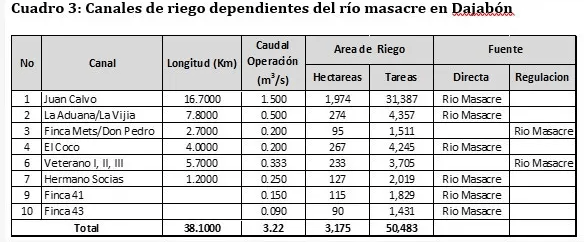 En suelo dominicano existen varios sistemas de riego en la zona de Dajabón, que se suplen de las aguas del río Masacre para el riego de una superficie total de 3,175 hectáreas (50,483 tareas).