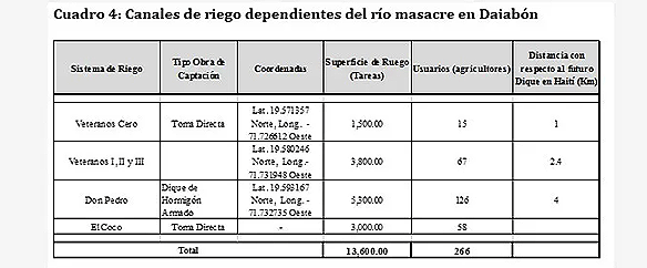 La mayor parte de los terrenos agrícolas que son servidos por los canales de riego dependientes del río Dajabón como fuente de agua, el 69.71 % de los terrenos agrícolas en suelo dominicano, tienen sus obras de toma localizadas aguas arriba del punto de derivación proyectado para el canal que las autoridades de Haití han estado construyendo.