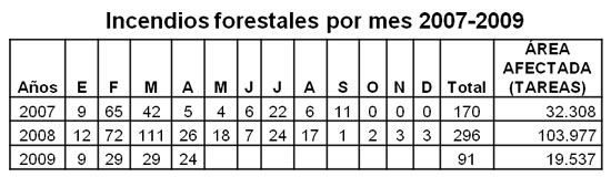 Un desglose de los incendios forestales en el primer cuatrimestre de 2009 revela que en enero se produjeron nueve incendios, afectando 1,536 tareas plantadas de pino y palo amargo. En febrero se incrementaron a 29, afectando 4,691 tareas plantadas de pino, pasto, yaragua y gravilea.