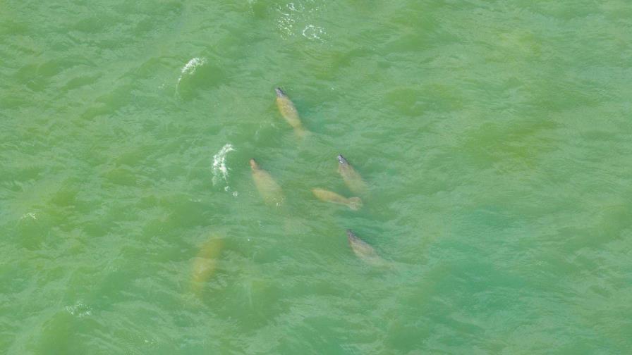 Basándose en la experiencia de los locales, los técnicos despegan un drone a unos 600 metros de distancia de la desembocadura. Flamencos y cucharetas cruzan el cielo mientras desde la distancia, en la pantalla del drone, se puede observar unas pequeñas manchas grises a pocos metros de la costa, en aguas poco profundas. Se sospecha que pueden ser manatíes, tal como lo advertía el ambientalista.