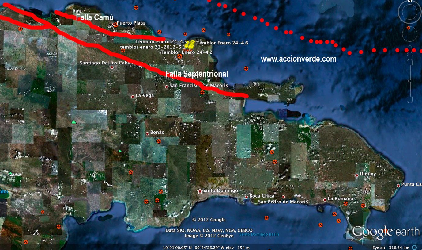 Los movimientos telúricos regsitrados en las últimas horas, entre el 23 y 24 de enero de 2004, se han producido con intensidades que van desde 4.1 a 5.2 (grados en la escala de Richter) y profundidades desde los 2.8 Kms y 31 Kms. Los mismos se han localizado muy próximos unos de otros en las proximidades de la costa del Cibao Central, entre las poblaciones de Magante, Río San Juan y «Tu Arena».