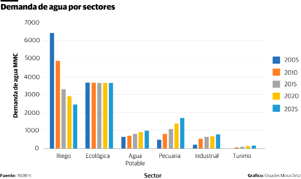 La demanda de agua en el sector agropecuario ocupa el mayor valor representando más del 60% para las estimaciones en el 2005, con una tendencia a la disminución en los años 2010, 2015, 2020 y 2025, aunque esta vez de acuerdo con las proyecciones. El sector ecológico por su parte sigue en importancia, requiriendo entre 32 – 37% de la demanda total, seguido por el sector agua potable que requiere entre el 6 -10% con tendencia al incremento; después aparece el sector industrial con demandas entre el 2 – 8% con tendencia al incremento y finalmente la actividad turística que requiere entre 1 – 2% de la demanda total con tendencia hacia un ligero incremento. El mismo PHN describe la demanda de agua por regiones y coloca al Yaque del Sur con un 38% de la demanda total, Yaque del Norte con 29%, Ozama -Nizao y Yuna, ambas con 13%, Atlántica con 4% y Este con 3%, respectivamente.