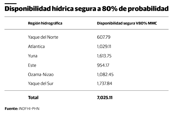 Aunque la disponibilidad de agua a nivel nacional se estima en 23,467.69 MMC, solo 7,025.11 MMC caen dentro de la categoría disponibilidad segura a un factor probabilístico del 80%. Regionalmente, la tabla siguiente ofrece los valores de disponibilidad segura.