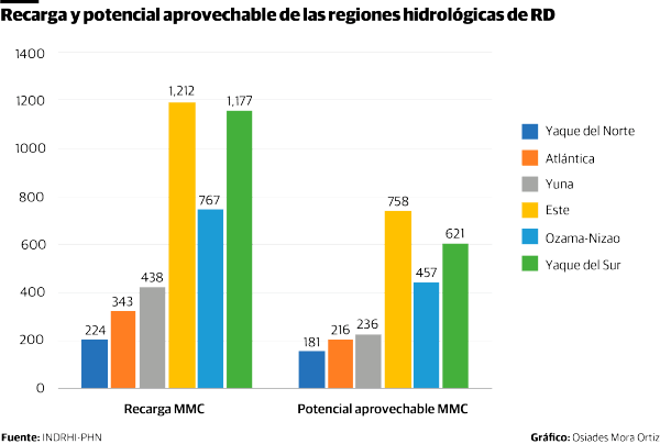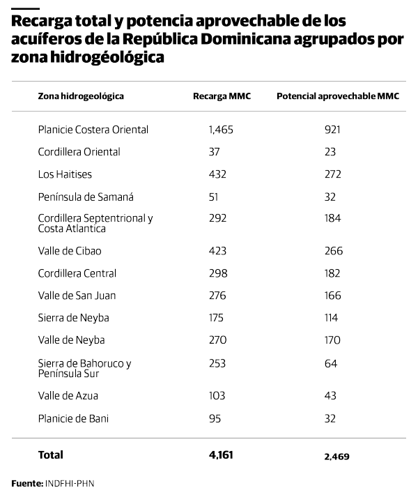 En cuanto a las aguas subterráneas, estas representan el 60 % de la disponibilidad de los recursos hídricos en el país. El 77 % de las aguas subterráneas provienen de la recarga directa de las lluvias o de la infiltración desde los cauces fluviales, un 15 % de retornos o infiltraciones de agua de riego y el 8 % restante a conexiones laterales con zonas contiguas. El INDRHI ha dividido al país en 14 zonas con un significado hidrogeológico claro, donde las sierras incorporan las principales regiones de recarga, en tanto que los valles, tectónicos y geomorfológicos, representan rutas de drenaje. Partiendo de lo anterior, el PHN ofrece estimaciones de recarga y potencial aprovechable del país basados en un estudio sobre el potencial hidrogeológico de la República Dominicana realizado por Rodríguez, H. y Febrillet, J.F (2006). El estudio reporta que la recarga total del país se aproximó en 4,161 MMC en tanto que potencial aprovechable fue de 2,469 MMC. A continuación, se ofrecen datos de recarga total y potencia aprovechable de los acuíferos de la República Dominicana agrupados por zona hidrogeológica.