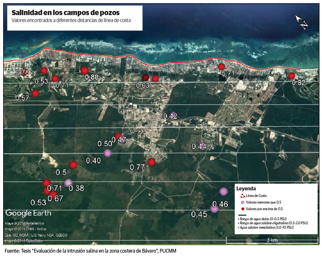 En el estudio se evidenció presencia de aguas salobres oligohalinas hasta los 6.1 kilómetros de distancia de la línea de costa, una medida que en la investigación se considera como un avance de 3 kilómetros si se compara con mediciones hechas en 2002 por otros autores.