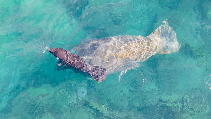 Cercano a las 7:00 de la mañana, en presencia del viceministro José Ramón Reyes y las autoridades locales de Medio Ambiente, se realizó el segundo vuelo, donde pude ver desde la altura, a unos 50 metros de la pared exterior de la laguna artificial, a la manatí que habíamos visto el día anterior. Mi corazón se paralizó mientras bajaba rápidamente para acercarme y tratar de localizar a la cría que no se percibía desde la distancia. De pronto, pude ver por la pantalla en mis manos, cómo la cría salía por debajo de la madre para tomar aire y la angustia se transformó en euforia y llantos, confirmamos que efectivamente era la madre y que la cría, seguramente por la noche, se había encontrado con ella.