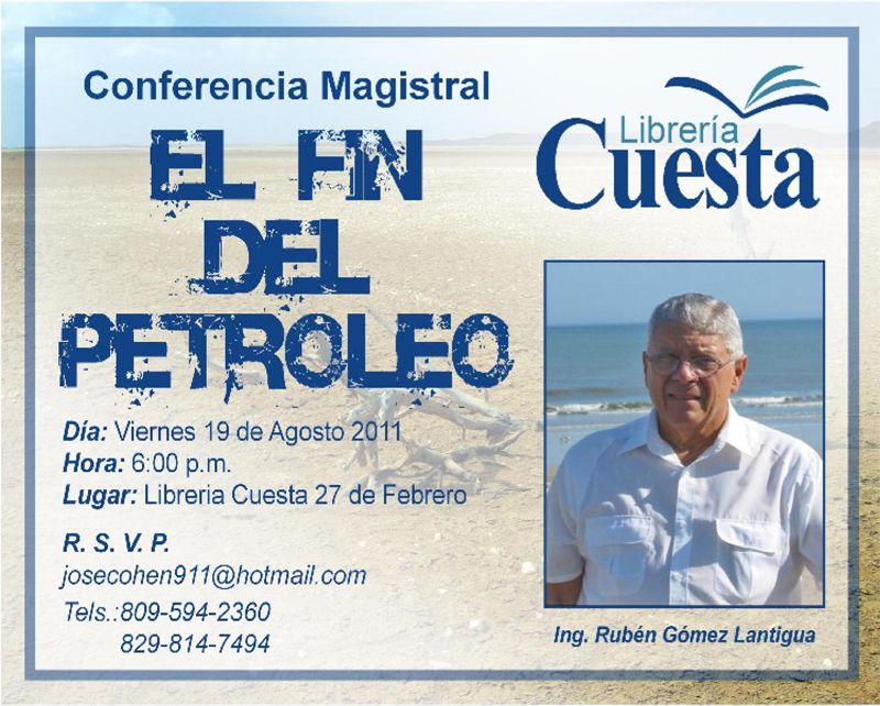 Por eso el amigo Rubén Gómez Lantigua tiene durante su visita quizá como la principal actividad una conferencia que ofrecerá sobre el tema. Ha sido escogido un escenario idóneo, el Fórum Pedro Mir de la Librería Cuesta. Será el 19 de agosto a las 6:00 de la tarde. Ese día cae viernes. Ya conocemos el tema: El fin del petróleo. Están invitados los estudiosos de ese tema, especialistas, académicos. El ingeniero geólogo debe ofrecer una versión sopesada, técnica, acerca del problema, sobre todo porque es el título de su conferencia, «El fin del petróleo». Tajante. Interesante no sólo para especialistas del área, interesante para todo el que se preocupa por los problemas fundamentales de la humanidad, que hoy son tan acuciantes, tan universales, tan inmediatos.