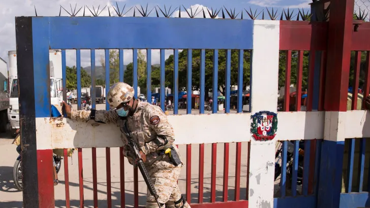 ACOMPAÑACRÓNICA: R. DOMINICANA HAITÍ. AME8461. COMENDADOR (R. DOMINICANA), 17/05/2021.- Un soldado dominicano cierra la puerta de la frontera entre República Dominicana y Haití, el 8 de mayo de 2021, en Comendador (República Dominicana). Niños con ropas polvorientas corren al lado de los todoterrenos, para pedir unas monedas, cada vez que se aproximan a una de las diminutas y paupérrimas aldeas que se esparcen por la carretera de montaña compartida entre República Dominicana y Haití, en el lugar más olvidado de la frontera. El comerciante dominicano Lorenzo Antonio Valenzuela es uno de los pocos comerciantes dominicanos que se acercan a este remoto mercado, y se queja de que para llegar a él, los militares le cobran ilegalmente 4.000 pesos (unos 70 dólares) para dejar pasar su camión. EFE/ Orlando Barría