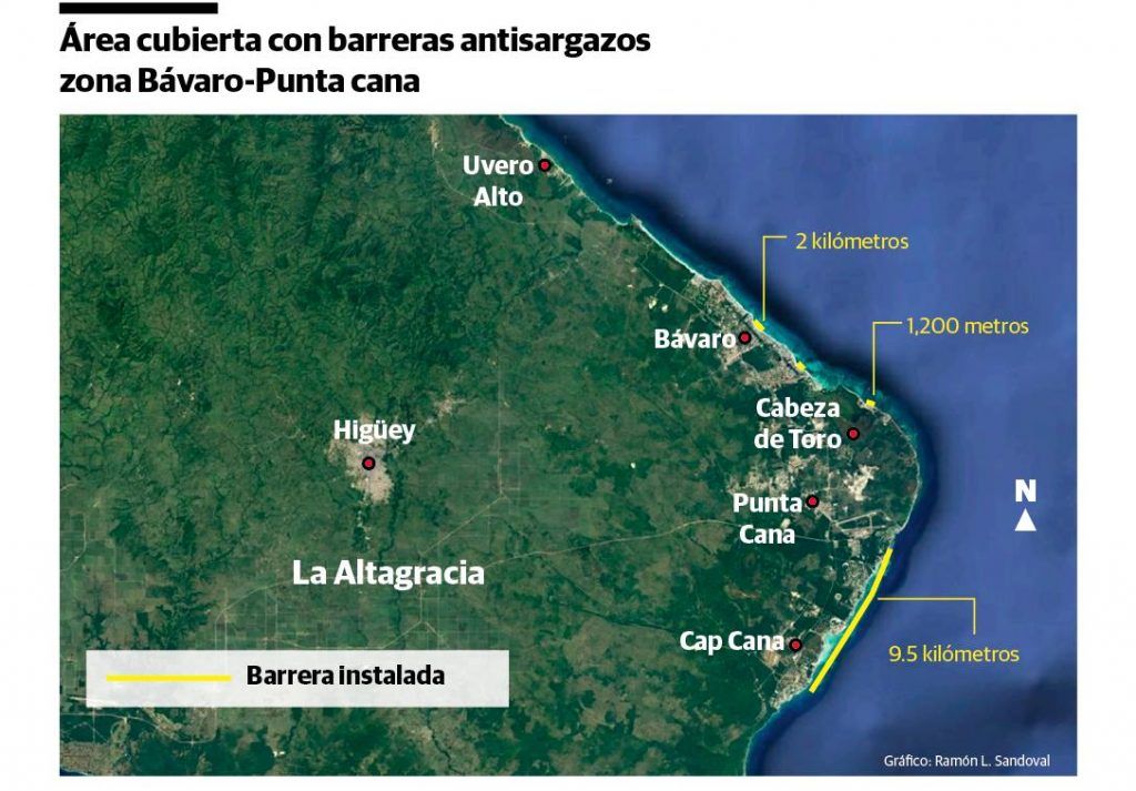 Vargas calcula que, de 31 kilómetros de área de playa en los hoteles de Bávaro, hay con barrera 12.7 kilómetros, equivalentes a una cobertura de 40 %. Para ser más específico, indica que el 95 % de la zona de Punta Cana-Cap Cana está protegida con barreras antisargazo, en Cabeza de Toro el 48 %, Bávaro 17 % y Uvero Alto 0 %.
