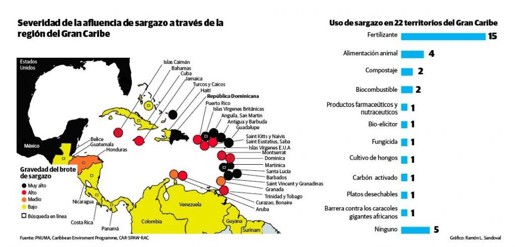 Desde 2015, el Ministerio de Medio Ambiente llamó a presentar propuestas sobre posibles usos al sargazo. Otto Cordero, encargado de Manejo Integrado de Ecosistemas de esa institución, indica que llegaron varios proyectos. El 80 % propone usar el alga como fertilizante; otra es convertirlo en biogás.