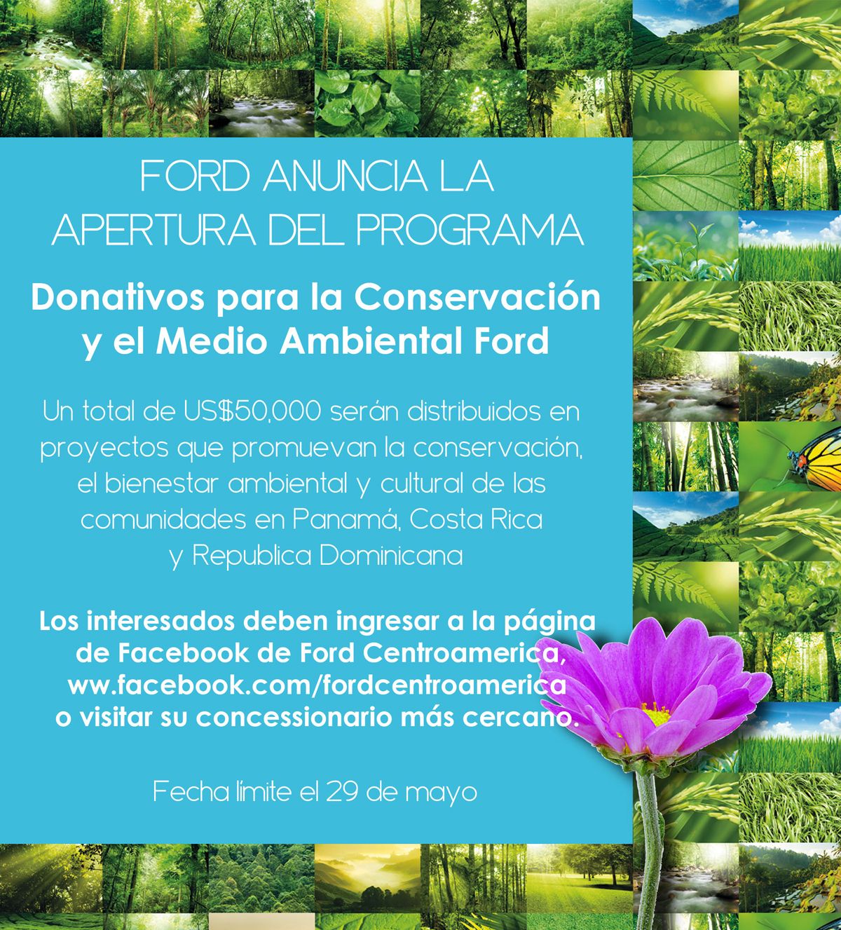 PanamÁ. p.a., 22 de abril de 2015 – Ford anuncia la convocatoria para el programa Donativos para la Conservación y el Medio Ambiente, cuyo propósito es apoyar individuos y organizaciones sin fines de lucro que donan su tiempo y esfuerzo para conservar y promover el bienestar ambiental y cultural en Panamá, Costa Rica y República Dominicana.