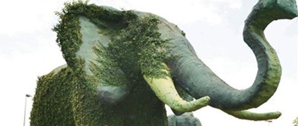 La planta elegida para cubrir a los animales del parque es la Ficus pumila, una trepadora de hojas perennes muy popular en el país para decorar setos y paredes grandes. Los frutos de esta hiedra son infértiles. Las ramas deben ser podadas para evitar que las hojas crezcan.