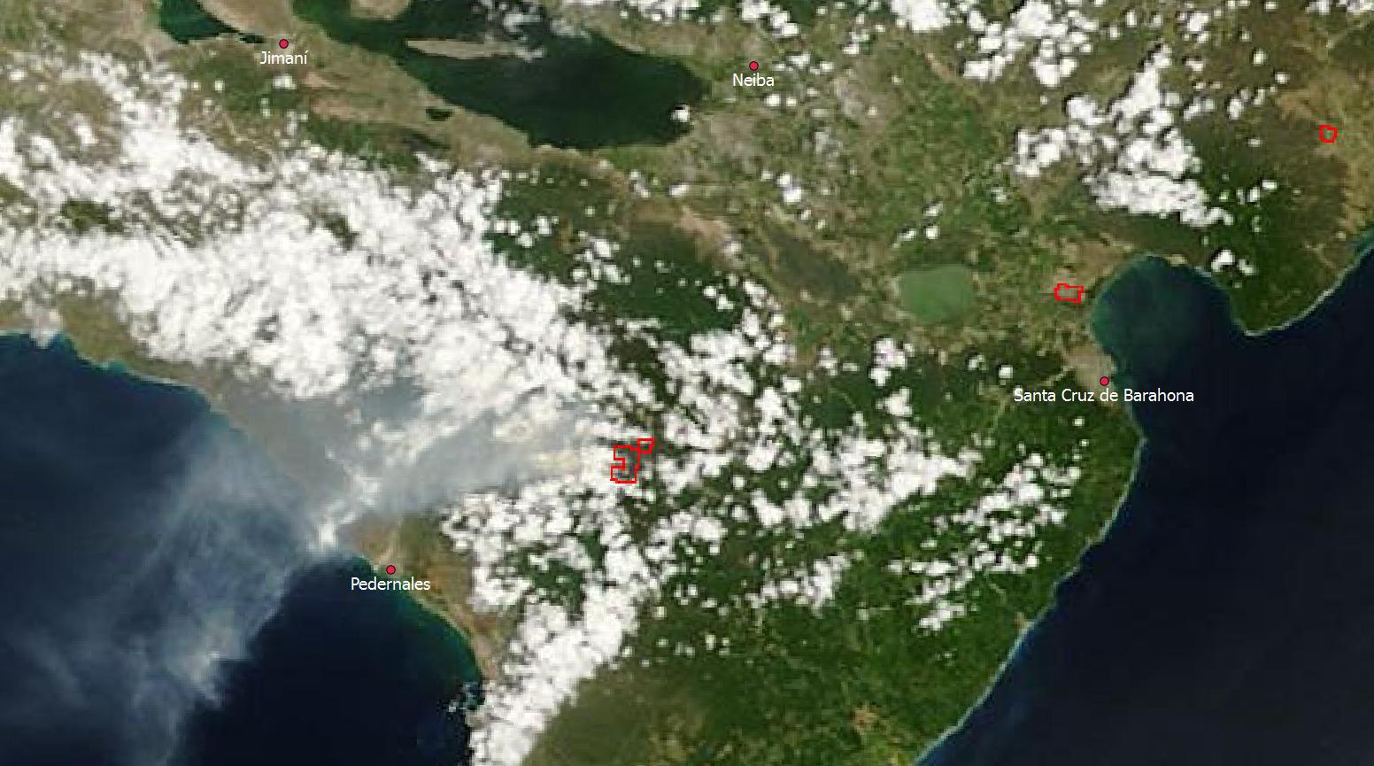 En esta imagen se observa el incendio declarado en días pasados en el parque nacional Sierra de Bahoruco. El área está próxima a algún lugar entre Pelempito/El Aceitillar/Canote, donde hay importantes superficies de pinar.
