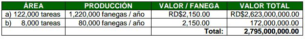 Las cifras totales están por el orden de 28,500 empleos directos y 40,000 indirectos. Y un volumen económico por concepto de la producción y la actividad agropecuaria en general en esta región, superior a los RD$10,000 millones por año, equivalente a US$4,839.15 millones en 20 años.