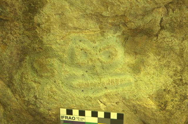 Colocado en la roca más grande y que sirve de techo inclinado, en solitario, haciendo frente a las demás figuras, se encuentra un petroglifo muy bien definido, en altorrelieve, de grandes ojos y bien definido espacio bucal, relevando además la dentadura. La numeraremos como Figura No. 13 (trece).