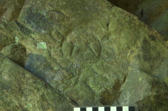 Otra figura humana, colocada junto a la Figura No. 2, se presenta con doble surco definiendo la cabeza, la boca muy abierta y dos surcos oblicuos que atraviesan toda la cara y cabeza a partir de la parte superior de las fosas nasales. La numeraremos Figura No. 3 (tres).
