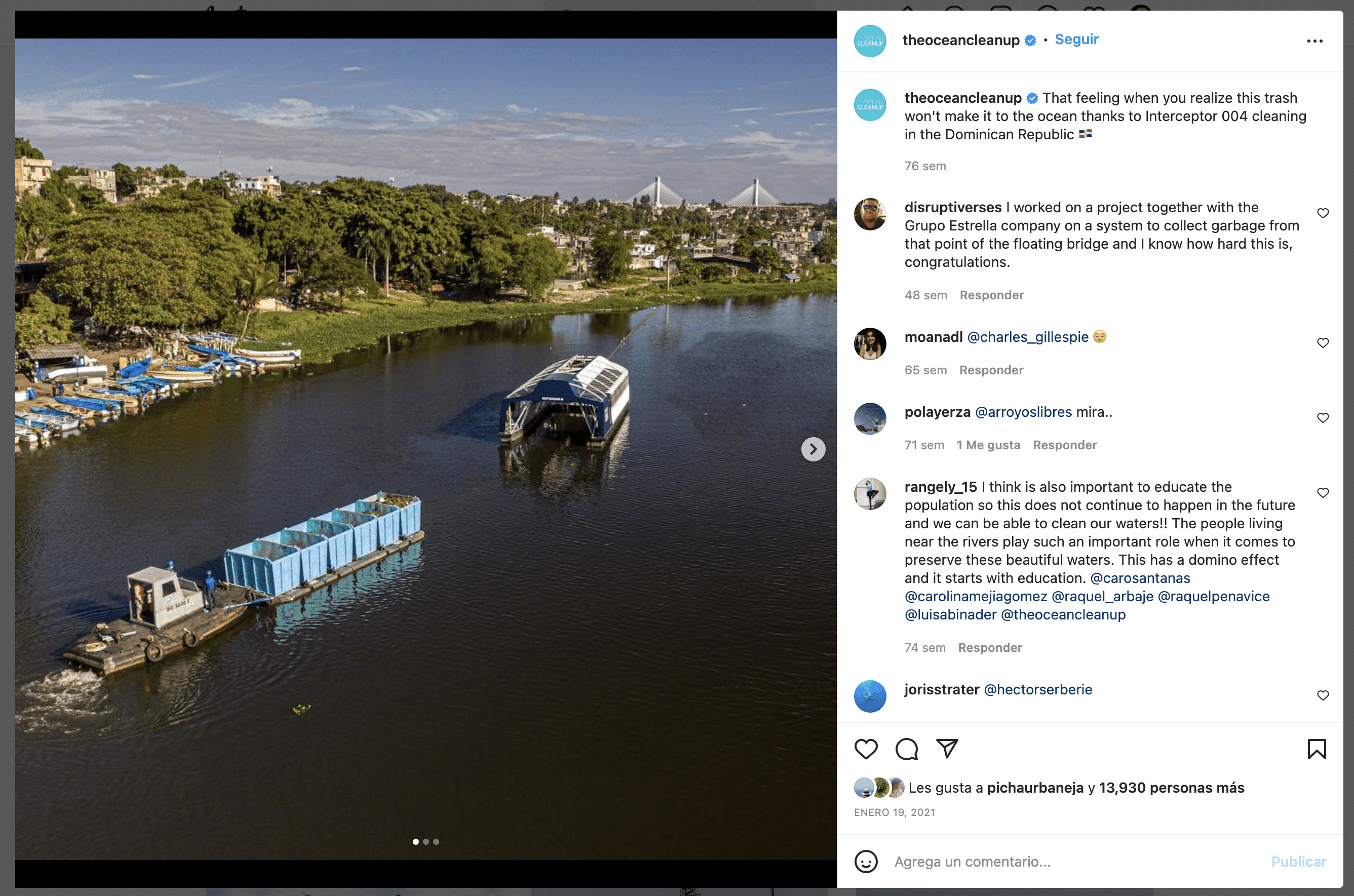 The Ocean Cleanup publicaba en sus redes una foto del Interceptor en su punto de operación con las palabras: “Ese sentimiento cuando te das cuenta de que esta basura no llegará al océano gracias a la limpieza del Interceptor 004 en República Dominicana”.