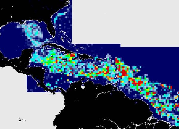 Hu compartió la siguiente imagen satelital tomada en el presente mes, donde se puede observar la cantidad de sargazo proveniente de Sudamérica ya en la zona del Caribe. Los puntos rojos representan mayor concentración.