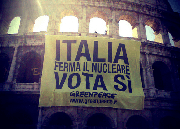 Aunque en Italia la energía nuclear está prohibida desde el desastre de Chernóbil de 1987, a principios del año pasado Silvio Berlusconi aprobó un decreto ley que permitiría utilizarla nuevamente, decreto que fue posteriormente refrendado por el parlamento. Pero el partido de oposición Italia de los Valores solicitó al Tribunal Constitucional que se decidiera a través de un referéndum, y así se hará.