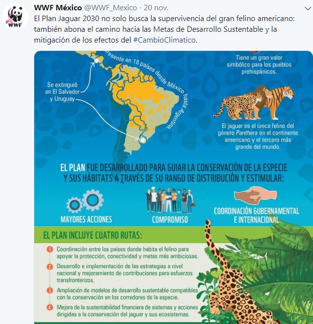 Con este plan, la responsable de WWF en México aseveró que se busca “encontrar colaboración entre los países” en los que habita el jaguar y “poder lograr una conservación integrada”, lo que les permitirá a “aspirar a lograr llegar a las metas de desarrollo sostenible que se prometieron”.