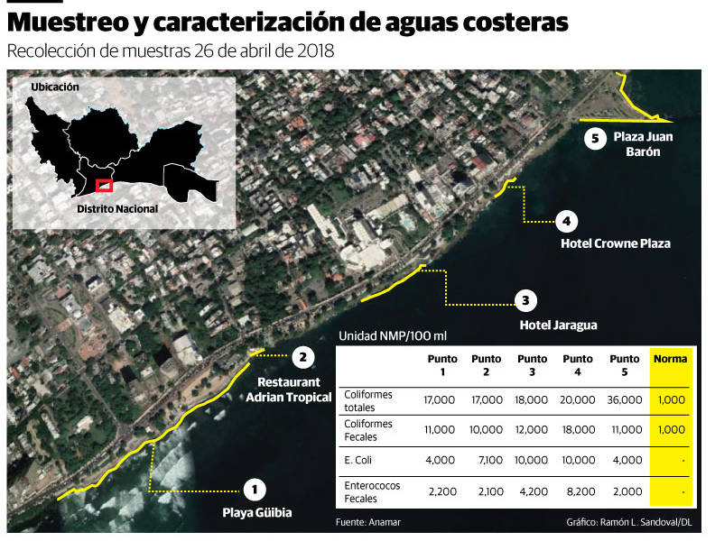 La contaminación de la costa de Santo Domingo ha sido probada desde hace décadas por investigadores. Una de las mediciones más recientes la hizo el ingeniero físico Emgelberth Vargas, encargado de laboratorio de la gubernamental Autoridad Nacional de Asuntos Marítimos (Anamar). El pasado 26 de abril tomó muestras en cinco puntos: la playa Güibia y los frentes del restaurante Adrian Tropical, de los hoteles Jaragua y Crowne Plaza y de la Plaza Juan Barón. En todos se determinó que el agua no es apta para entrar en contacto directo con personas y, como el 100 % presenta contaminación por bacterias, se determinó que estos ambientes no son saludables.