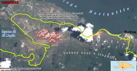 Mapa del límite septentrional de la reserva biológica Loma Charco Azul, mostrando parte del lago Enriquillo y de la laguna de El Limón (hacer clic para una versión de mayor resolución), sobre una imagen reciente del satélite Landsat 8, de fecha 10 de agosto de 2013. Elaborado por José Ramón Martínez Batlle, Ph.D