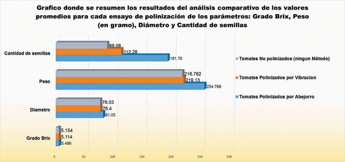 Los parámetros que se utilizaron para evaluar el rendimiento del cultivo fueron grado brix (contenido nutricional de azúcares), peso, diámetro y cantidad de semillas. En cuanto al grado brix, no hubo diferencia significativa entre los tomates cosechados en invernadero experimental y los tomates cosechados en invernadero sin abejorro. Sin embargo, en cuanto a los otros tres parámetros, el área con abejorros presentó resultados con mejoras importantes (ver gráfico).