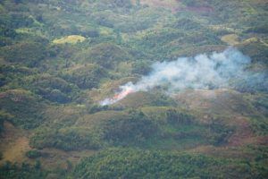 A las 10:00 a.m. despegamos desde el aeropuerto El Higüero con rumbo noreste hacia la zona de Sabana de la Mar, pues ya teníamos reportes de mucha depredación avanzando por esos lares. Sin embargo, no fue necesario llegar hasta esa zona pues tan pronto nos acercamos a los límites del lado sureste del área protegida eran evidentes los pequeños incendios provocados con el objetivo de eliminar el bosque para la práctica de agricultura invasiva.