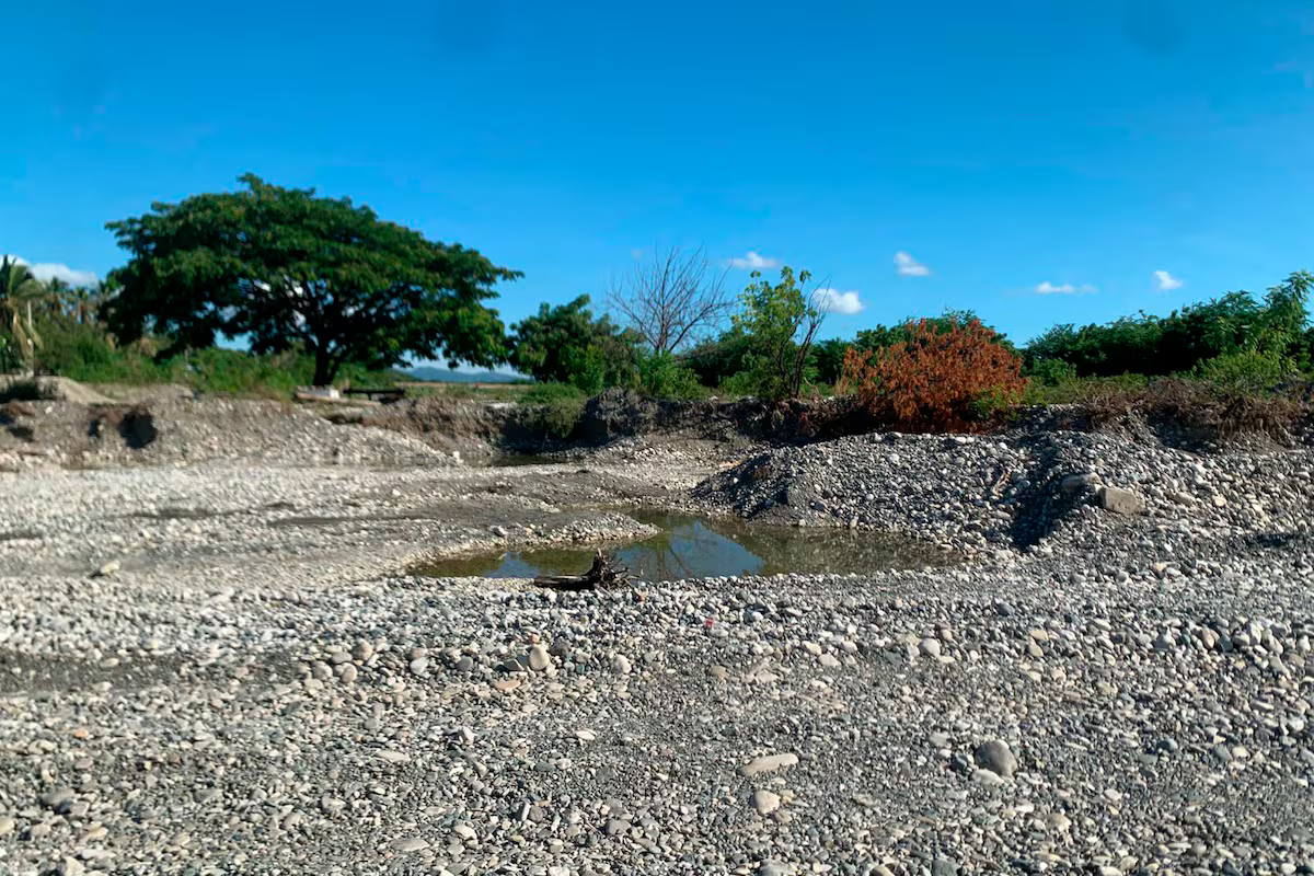 Como en un viejo Western, una caseta vacía custodia la entrada al río Nizao, en el tramo que atraviesa El Roblegal, en la sección Las Barias, del municipio Baní, en el sur de la República Dominicana. En ocasiones, dicen los vecinos, un vigilante armado controla el paso y solo permite el ingreso de camiones y maquinaria pesada. Alrededor de 25 volquetas entran y salen cargadas de agregados —arena y grava que se usan para la construcción—, levantando una nube de polvo entre piedras y charcos estancados, evidencia de un ecocidio que, poco a poco, ha hecho desaparecer el río bajo tierra.