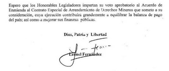 Solo basta con ver este ultimo párrafo del esta comunicación enviada a congreso para ver quien es que motiva y apadrina la estafa de la Barrick Gold, yo espero presidente que no le salga huyendo a su responsabilidad, ni le tire la cuaba a otro como lo hizo jodiendo a Jaime David y quedando impune en el caso de la cementera en los Haitises.