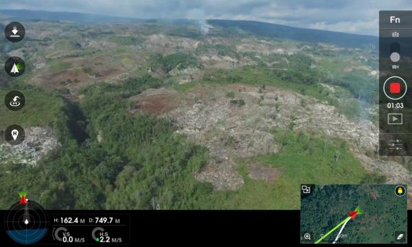 En esta captura del iPad podemos ver la deforestación desde el punto del vista del drone. Abajo, inserto, el mapa de navegación correspondiente al 2012. Existe una marcada reducción de la vegetación.